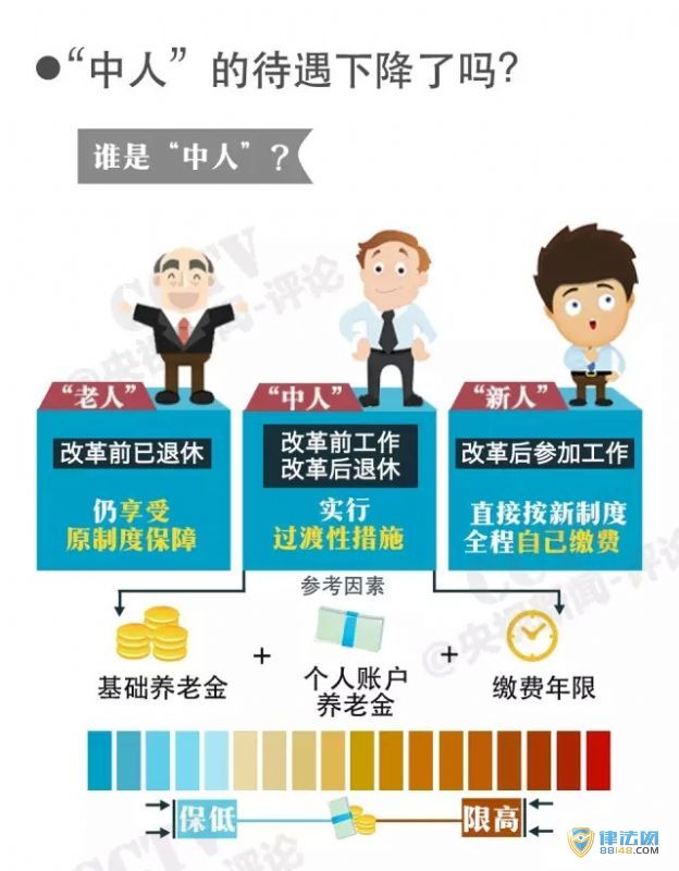 值得注意的是,本次改革实行“老人”老办法、“中人”中办法、“新人”新办法。相对于“新人”(办法实施后参加工作的)和“老人”(本办法实施前为编制内工作人员且已经退休的),改革前参加工作、改革后退休且累计缴费年限满15年的“中人”的待遇如何过渡成为社会关注的焦点。