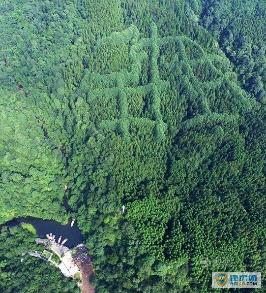 2015年7月17日,四川成都,邛崃市马坪村一块山脊上出现一处由植物组成的巨型图案,从高空俯瞰形似“犇”字。