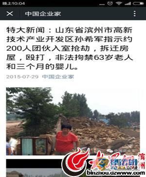 7月26日,微信圈里发出一条“特大新闻”称,2015年7月25日,滨州市民李翠珍在承包地上建造的20多间房屋以及2500多平方米的养殖大棚遭遇滨州市高新区小营办事处强拆,屋内床、橱柜、电视、冰箱、洗衣机、电脑等家具及生活物资全部被埋在废墟中,7000多只家禽死亡。强拆过程中,李翠珍及女儿 、女婿还有3个月大的外甥遭到殴打被强行抬上车拉走,后被关在一间屋子里限制人身自由达6小时以上。该微信还晒出了多张拆迁现场照片以及土地承包合同和公证书。此微信发出后,引发网友广泛关注,并迅速传播。