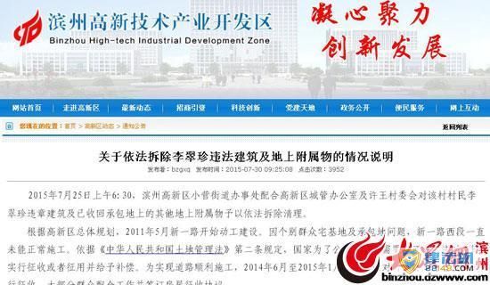 2015年7月25日上午,滨州高新区小营街道办事处配合高新区城管办公室及许王村委会对该村村民李翠珍违章建筑及已收回承包地上的其他地上附属物予以依法拆除清理。“对李翠珍违法建筑的拆除清理行为是按照相关法律规定和政策进行的合法行为,希望广大网民不要相信和传播网上毫无根据的谣言。”该工作人员告诉记者