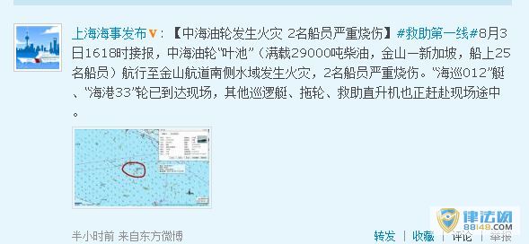 据“上海海事发布”微博消息,8月3日16时左右接报,中海油轮“叶池”(满载29000吨柴油,上海金山—新加坡,船上25名船员)航行至上海金山航道南侧水域发生火灾,2名船员严重烧伤。“海巡012”艇、“海港33”轮已到达现场,其他巡逻艇、拖轮、救助直升机也正赶赴现场途中。