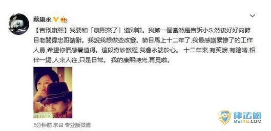 腾讯娱乐讯 10月16日消息,今天下午,蔡康永[个人资料]突然在微博上发文称要离开《康熙来了》,称做了十二年,自己累惨了,要想做些改变,微博发出后,不少粉丝纷纷表示不舍。