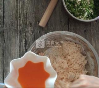 9. 剩下的汁倒猪肉里面,放盐、油、鱼露一起搅拌,沿一个方向不断搅拌,这样肉可以锁水。
