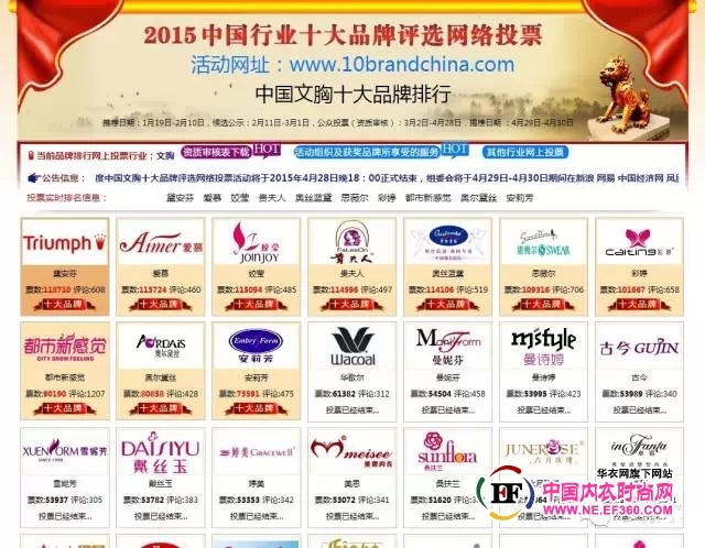 “2015年度中国文胸十大品牌评选”日前落下帷幕。“2015年度中国文胸十大品牌评选”采用消费者投票+资质审核制度,不但企业参与评选需要经过资质认证,而且组委会对消费者投票进行24小时监票,有力的杜绝了恶意刷票的现象,保证了评选的公平与公正。本次荣登“2015年度中国文胸十大品牌”榜单的优秀企业和品牌如下: