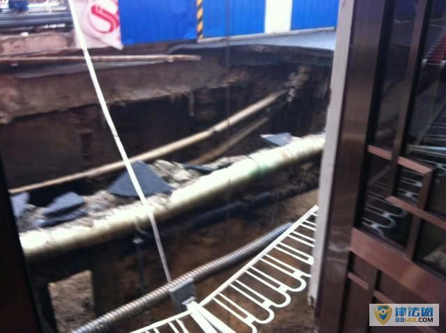 塌方的坑口有一车道宽,七八米长,坑深近20米。由于坑口紧邻路边商铺,有市民被困在商铺内。