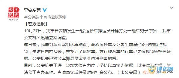 广东省东莞市公安局官方微博11月4日消息,10月27日,东莞市长安镇发生一起“运钞车押运员开枪打死一砸车男子”案件,东莞市公安机关迅速立案调查。东莞男子追砸运钞车被押运员击毙视频