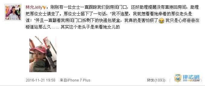 林允发文写道“刚刚有一位女士一直跟踪我们到房间门口,还好助理提醒没有直接回房间,助理把那位女士请走了。那位女士留下了一句话,‘我不追星,我就想看看她牵着的那位老头是谁!’并且一直翻着我房间门口拆剩下的快递包装盒,我真的是害怕极了。我只是心疼爸爸在楼道站那么久……其实这个老头子是来看她女儿的”。林允还附上了两张自拍照,照片中她带着一顶粉色的鸭舌帽,林爸爸站在她身后关切地看着女儿。