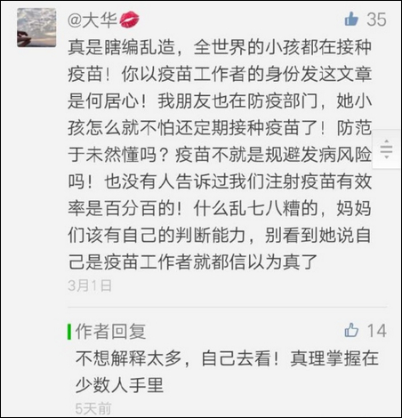 昨天(8日)晚上,@急诊夜鹰 晒出了几张微信公众号"关注疫苗安全"的文章评论截图,引起了广泛关注。