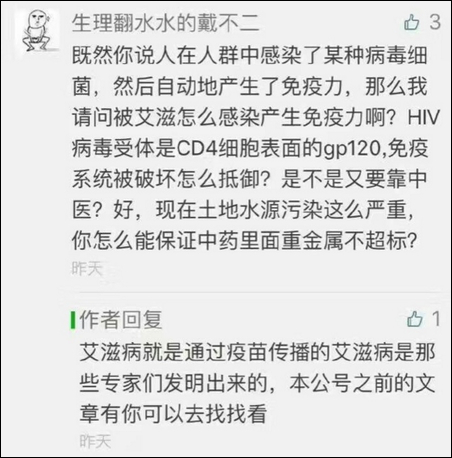 网友用艾滋病来反驳他的观点,作者说艾滋病是专家发明的,是通过疫苗传播的……