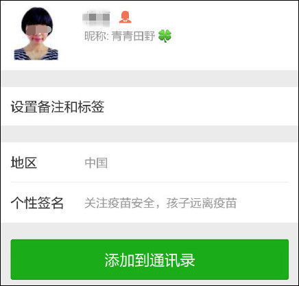 这个名叫"青青田野"的人,微信签名就是"让孩子远离疫苗"。