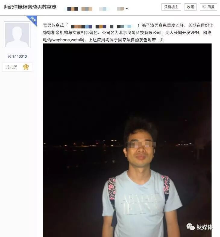 值得一提的是,就在9月7日苏享茂自杀当天,9月7日凌晨,百度渣男吧有一名新注册小号“实话110010”发帖,称苏享茂为“骗子渣男身患重度乙肝”,“长期在世纪佳缘等相亲机构与女孩相亲骗色”,并附上了苏享茂本人照片。