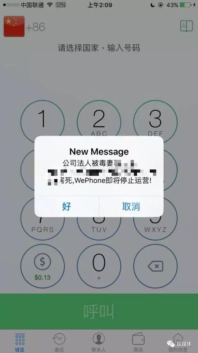 在苏享茂自杀前,他还在Wephone设置了一个提醒,可以说是用“生命”对前妻实施的“报复”。以下是打开Wephone的截图,一些使用WePhone的用户收到了App弹出的提醒,称公司法人已被“害死”,WePhone即将停止运营。