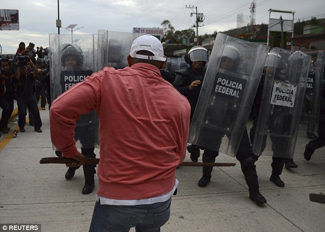 2015年2月,在墨西哥的阿卡普尔科市,示威者持一根木棍与防暴警察对峙