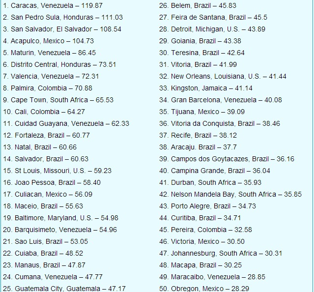 虽然名单以拉丁美洲城市居多,但是也包含其他地方。如,南非的开普敦,排名第9;密苏里州的圣路易斯,排名15;马里兰州的巴尔的摩,排名19;密歇根州的底特律,排名28;路易斯安那州的新奥尔良,排名32;牙买加的金士顿,排名33;南非的约翰内斯堡,排名47。