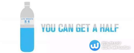 如何让另一半水更有用?如果能将一瓶矿水泉一分为二,一半留给消费者,一半由消费者赠与缺水地区,那简直棒呆!可是,如若以同样的价格,却只售出一半容量的矿泉水,消费者愿意买单吗?Life Water公司决定,必须为节省水资源做点什么,于是有了半瓶水概念。