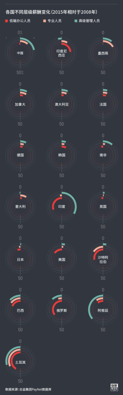发达国家的不同层次就业者间的工资增幅差距较小,如英国、法国、意大利。这与政府定期提高最低工资标准和强有力的工会不断讨价还价有关,此外来自公众要求高薪者分担经济危机负担的压力,也使得三类人之间工资增长步伐较为一致。在印度和中国这两个经济发展阶段较为近似的国家,三种层次职业薪资增长的鸿沟最大。这部分加剧了社会贫富差距的分化。