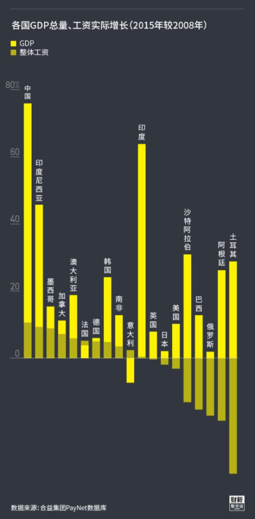 但从另一角度看,虽然中国整体工资增长最快,但与GDP增幅相比,二者差距仍最大。印度整体工资增长2%,与其63.8%的GDP增幅相比,差距略低于中国。相较之下,意大利GDP下降7.3%,工资仍保持了2.4%的增长。