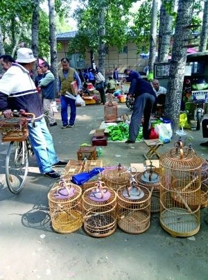 昨天上午,记者来到北沙滩桥附近,看到临时集市藏身于一片杨树林里,并被高高的围墙围了起来。树林里卖鸽子的、卖小鸟的、卖鱼的、卖虫的、卖古玩的摊子应有尽有。其中,售卖小鸟的摊子有五六个,有的把鸟笼直接挂在树上,有的则在地上铺开来,几十只鸟笼排成一排(如图)。据了解,有护鸟志愿者在上周末拍到的图片中,几百只鸟儿被关在笼里售卖。