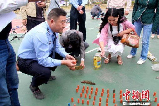 图为办案民警展示犯罪嫌疑人制造的弹药。 钟欣 摄